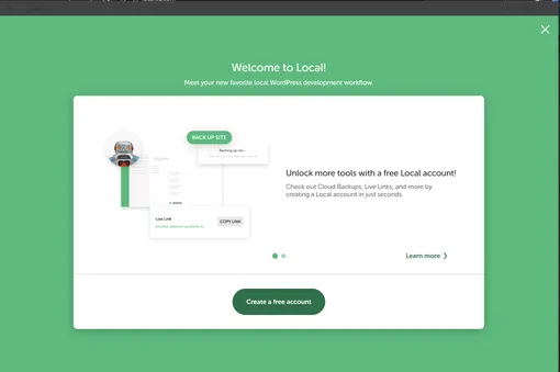 After installing Local, you’ll be greeted with a “Welcome to Local” page prompting you to create an account. An account is not necessary for our purposes, and you can close this using the X in the top right.